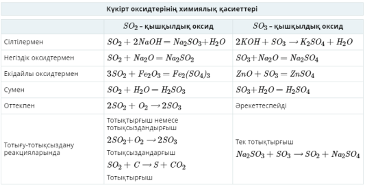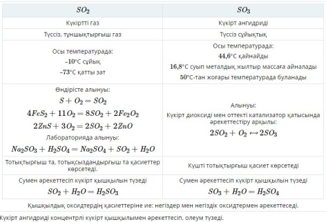 Күкірт екі түрлі оксид түзеді. Олардың физикалық және химиялық қасиеттері төмендегі кестеде көрсетілген. |