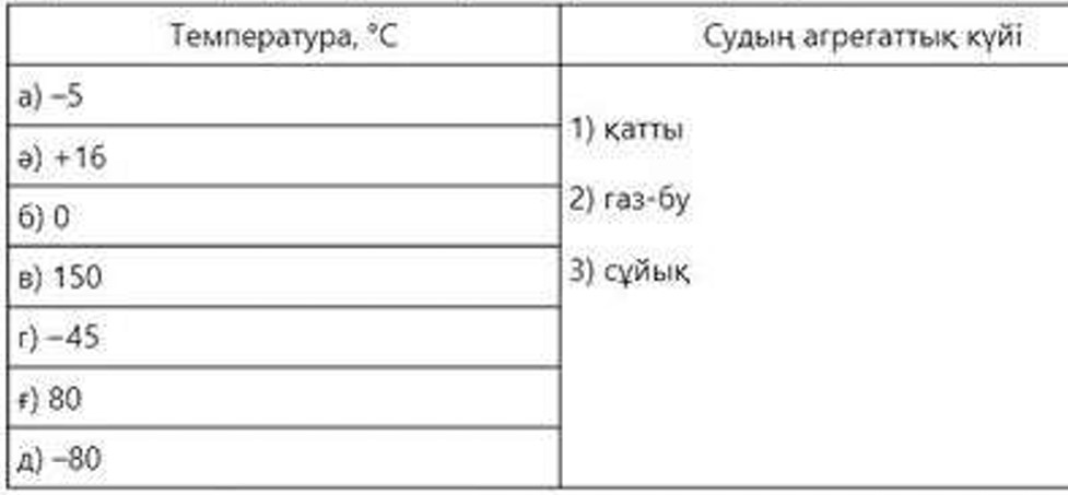 Дескриптор: судың ластану көздерін анықтайды; Жалпы балл-3 Дескриптор : табиғаттағы судың айналым бағытын дұрыс көрсетеді; судың табиғаттағы айналым кезіндегі үдерістер атауын жазады. Жалпы балл- 4 Дескриптор : берілген температуралар мен судың агрегаттық күйін сәйкестендіреді; Жалпы балл-3 |