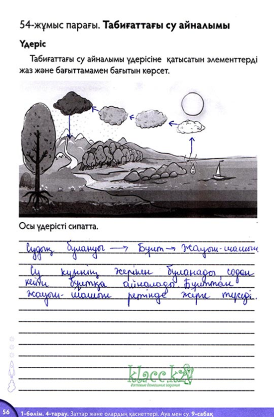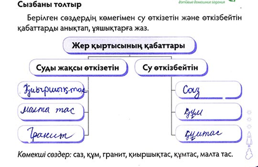 Мәтінмен жұмыс. Мақсаты: тақырыпты аралық бекіту 1 Мәтінді оқып шығу. 2 Сұрақ-жауап әдісімен білімдері бекітіледі, кері байланыс жасалады. Ойлан. Өсімдіктер табиғаттағы су айналымы үдерісіне қатыса ма? 3. Сәйкестендір. Оқушылар бес топқа біріктіріліп, алдыңғы айдардың мазмұнымен байланысты талдау жалғастырылады. Топтар «Су айналымына қатысатын жауын-шашын деген не?» және «Жауын-шашын қандай болады?» деген сұрақтарға жауап іздейді. Әр топқа жауын-шашын түрлері бейнеленген үлестірмелі парақшалар: 1-топқа – қар, 2-топқа – жаңбыр, 3-топқа – қырау, 4-топқа – шық, 5-топқа – бұршақ суреттері және жауын-шашынның сипаттамалары таратылады. Оқушылар берілген сипаттамаларды оқып, оның жауын-шашынның қай түріне жататынын табады және суретімен сәйкестендіреді. 4. Сызбаны толтыр Дәптердегі сызбаны толтырады