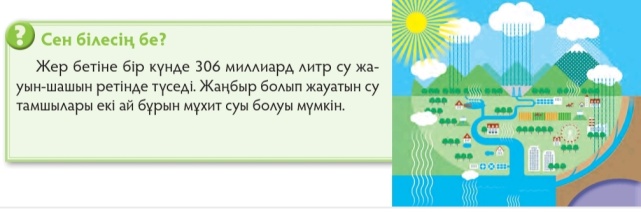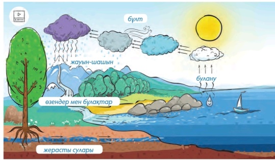 Табиғатта су айналымы қалай жүретінін зерттейді. Мәтінді түсініп оқиды. Сұраққа ойланып жауап береді. |