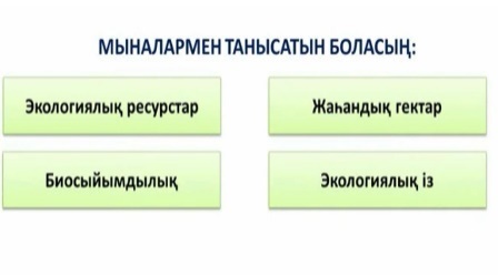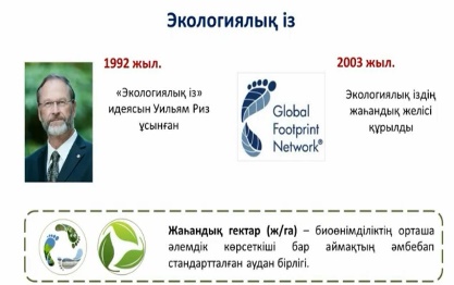 Дескриптор: 1.Студенттер суретте көрсетілген, анықтамалық, терминдік сөздерді талдайды, дәптерлеріне жазады. 2.Экологиялық із ұғымының маңыздылығын ашады. 3.Экологиялық ресурстар, жахандық гектар, биосыйымды-лық туралы ақпараттарды зерттейді. Барлық студенттер өз экологиялық іздерін есептеп шығарады. |