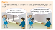 Жаңа тақырып «АДАЛ АЗАМАТ» біртұтас тәрбие бағдарламасындағы құндылықтарды оқу процесіне ұйымдастыру кезіңінен бастап, сабақтың әрбір кезеңінде жүргіземін. 1-тапсырма Бейнесін тап Айсұлу демалыс күні сауда ойын-сауық орталығына барды.Ол бір дүкеннің шынысынан өз бейнесін көріп қалды. Айсұлу өз бейнесін тағы қайдан көруі мүмкін?Бұл заттар несімен ұқсас? Беті өте тегіс затты айнаға теңеп, «айнадай» деп жатады.Айнадан өз бейнемізді көреміз.Неліктен?Себебі айнадай тегіс заттың бетінен жарық шағылады.Беті тегіс емес заттардан бет-бейнемізді көре алмаймыз. Зертте Мақсаты: 1.Айнаны немен алмастыруға болады? 2.Парақтың көмегімен қабырғаға сәуле түсіруге бола ма? Құралдар: Жұмыс барысы: 1.Фонарьды айнаға бағытта. 2.Сәулені қабырғаға түсір. 3.Басқа заттармен қайтала. 4.Қай зат жақсы шағылдыратынын бақыла. Бақылау: Мысал келтір 2-тапсырма Суреттерге мұқият қара. Жарықтың шағылу қасиеті пайдаланылған заттарды ата. Өзің де мысал келтір. Жауабы: Жарық шағылуы қолданылған