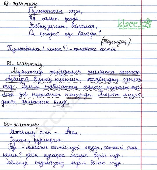 Шаттық шеңберін жасайды Жатыс септігін пысықтайды Әңгімесін оқып береді Топтарда бір-біріне қолдау көрсетеді Нақыл сөздің мағынасын айтады Тапсырма бірдей болғанмен нәтиже әртүрлі болады Қарамен жазылған сөздерге сұрақ қояды Ережені түсініп алады Кйбір оқушылар басқа сыныптастарына қарағанда анағұрлым күрделі дереккөздермен жұмыс істей алады Шығыс септіктегі сөздерді табады Зат есімдерді септейді Сөйлем мүшелеріне талдайды Үй тапсырмасын алады Кері байланыс жасайды |