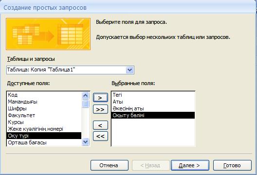 Сұраныс шеберінің көмегімен қарапайым сұраныс құруға болады. Мысалы негізгі кестеден информатика мамандығы бойынша оқитын студенттер тізімін бөліп алу қажет. Ол үшін Создание мәзірінен Мастер запросов батырмасын басып, Простой запрос батырмасын басып, ашылған терезеден қажетті өрістерді таңдау қажет: