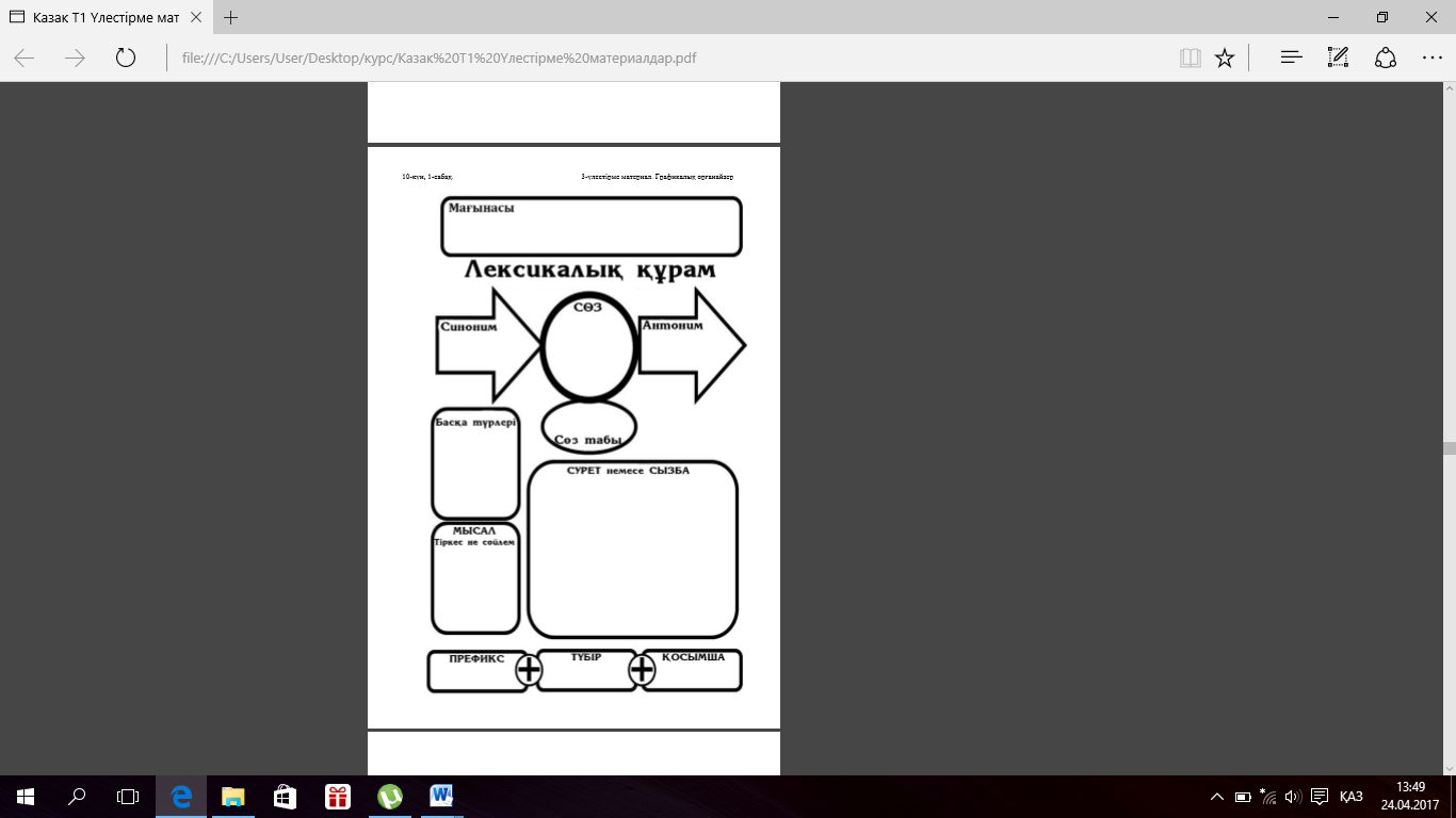 стратегиясы арқылы « Сәулетші» тобы толық оқиды. Идеясы мен тақырыбына талдау жасайды Түсінбеген сөздеріне талдау жасады. Дәптермен жұмыс «Графикалық органайзер» «Қапбілеттілік» сөзін графикалық органайзер негізінде лексикалық құрамын анықтайды.