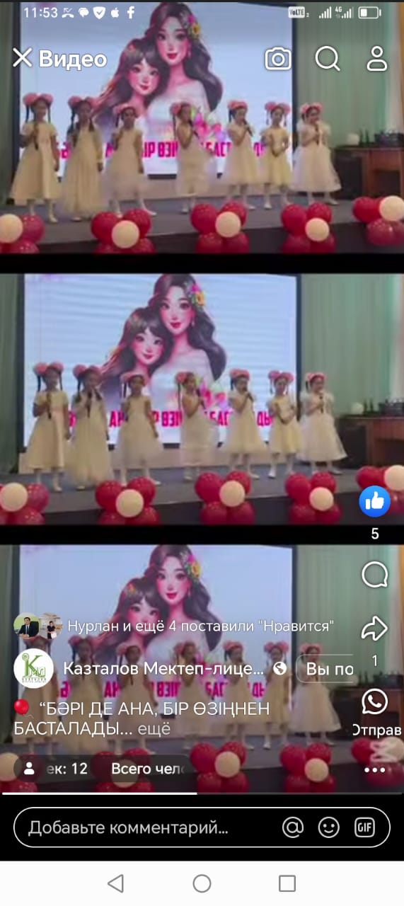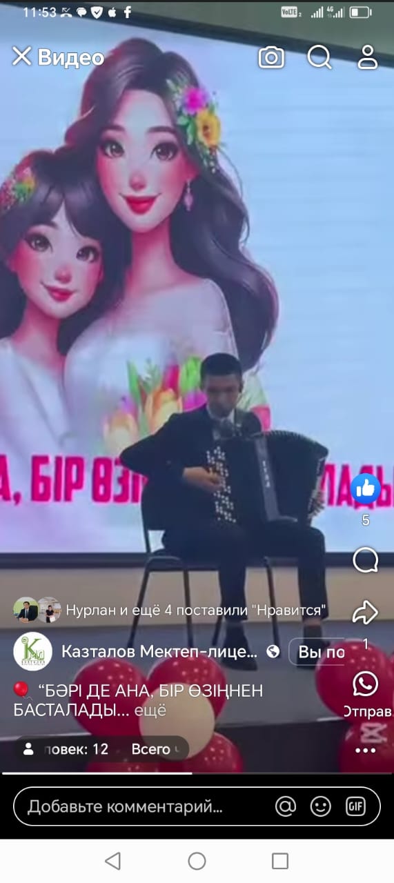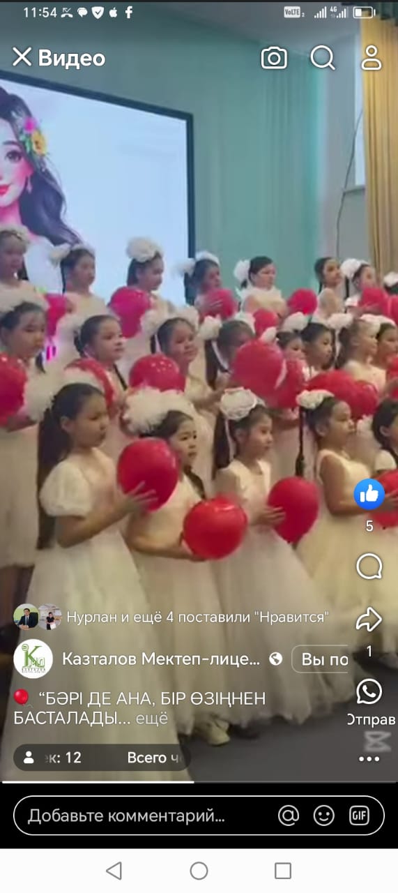 8 НАУРЫЗ – Аналар күні , казталов мектеп-лицейінде « Бәрі де ана ,бір өзіңнен басталады....» -,атты мерекелік концерт оздырылды. Концерттік бағдарламада аруларымызды,ұстаз-аналарымызды құттықтап сөзде сөйледі,мыңбұралған биде, әуелеткен әнде, театрландырылған көріністе болды.