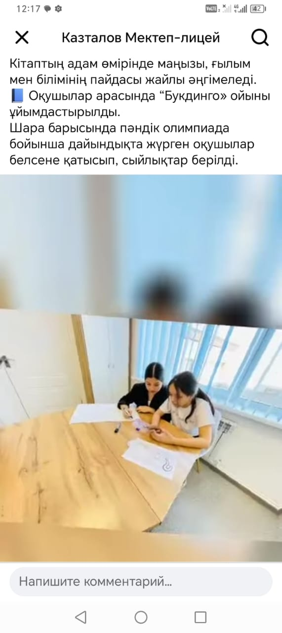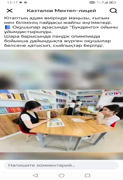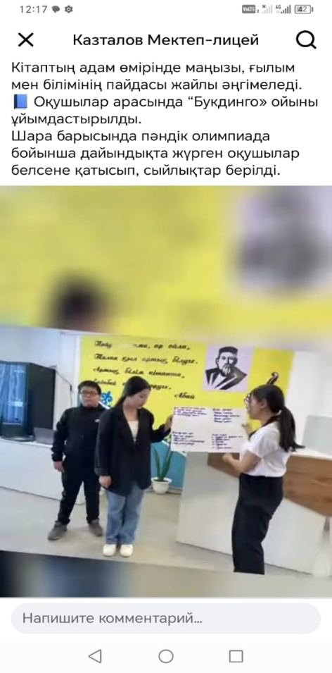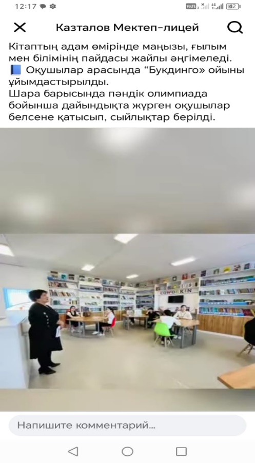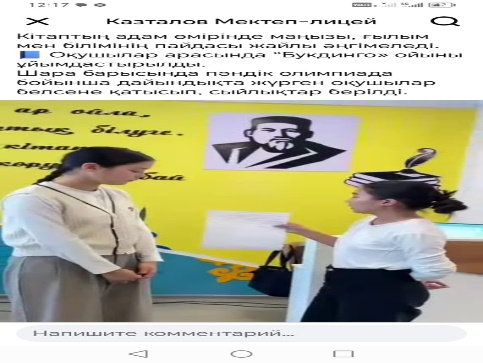 Кітаптың адам өмірінде маңызы, ғылым мен білімінің пайдасы жайлы әңгімеледі. ? Оқушылар арасында “Букдинго» ойыны ұйымдастырылды.