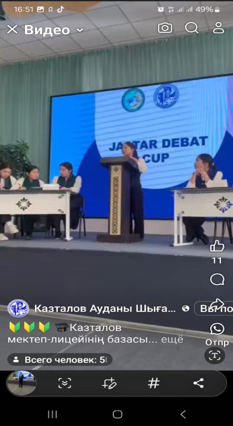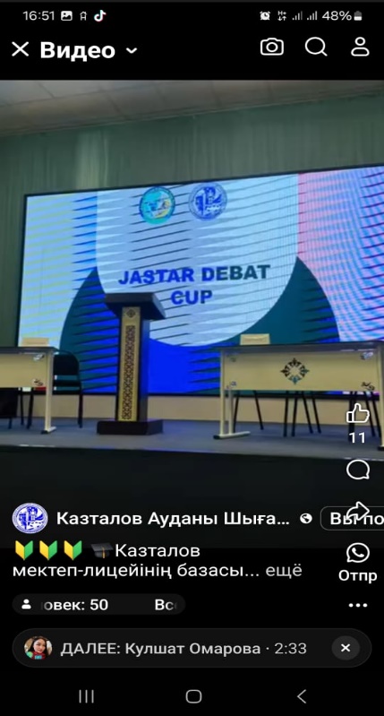 07.02.2025 ж Казталов мектеп- лицейінде «Ақиқат» дебат үйірмесінің жетекшісі Даулет Сегуатовтың ұйымдастыруымен «Ұшқыр ой алаңы» жобасы аясында дебат өткізілді. Аталмыш дебат ойынына 8-9 сынып оқушылары да қатысып, берілген қарарлар бойынша өз пікірлерін ортаға салды.