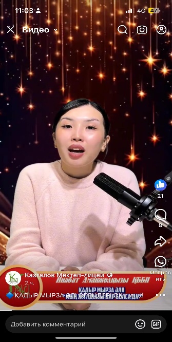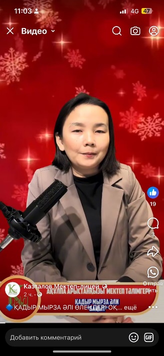 5 қаңтар—ақын, Қазақстанның халық жазушысы Қадыр Мырзалиевтің туған күні. Айтулы күнде Казталов мектеп-лицейінің «Мектеп театрының» бір топ ұстаздары ақынның өлеңдерін оқып, поэзиясын насихаттауға өз үлестерін қосты.