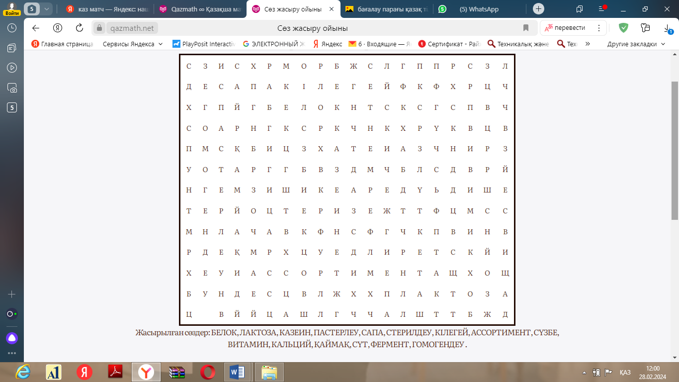 Жаңа материалды бекіту үшін тест жұмысын https://wordwall.net/ru/resource/69071996/сүт-өнімдері ұсыну. |