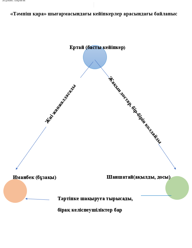 2-тапсырма Кейіпкерлер арасындағы байланыс (Схема құру) (тапсырманы алғашқы дұрыс жасаған 3 оқушыға балл толық беріледі) Төмендегі сұрақтарға жауап бере отырып, кейіпкерлер арасындағы байланыс схемасын жасаңыз. Басты кейіпкер кім, кіммен жақын қарым-қатынаста? Қай кейіпкерлер арасында қарама-қайшылық бар? Кейіпкерлердің өзара қарым-қатынасы олардың мінез-құлқына қалай әсер етеді?