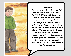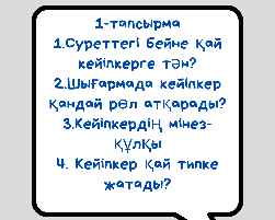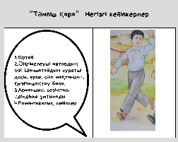 ● Суреттегі бейнені анықтайды; ●Шығармадағы рөлін түсіндіреді ; ● Мінез-құлқын сипаттайды; ● Кейіпкер типін дұрыс анықтайды;
