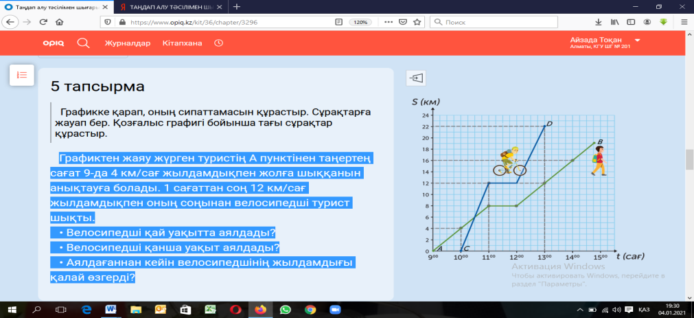 Графиктен жаяу жүрген туристің А пунктінен таңертең сағат 9-да 4 км/сағ жылдамдықпен жолға шыққанын анықтауға болады. 1 сағаттан соң 12 км/сағ жылдамдықпен оның соңынан велосипедші турист шықты. • Велосипедші қай уақытта аялдады? • Велосипедші қанша уақыт аялдады? • Аялдағаннан кейін велосипедшінің жылдамдығы қалай өзгерді?