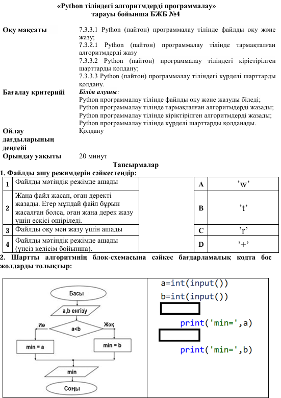 БЖБ орындау Дескрипторлар: - Файлды ашудың 1,2 режимін ажыратады - Файлды ашудың 3,4 режимін ажыратады - Бағдарлама кодын толықттырады - Бағдарламаның орындалу нәтижесін анықтайды - Бағдарламада шығыс нәтижесін анықтайды - OR логикалық операциясының нәтижесін анықтайды - Блок-схема бойынша бағдарлама кодын жазады |