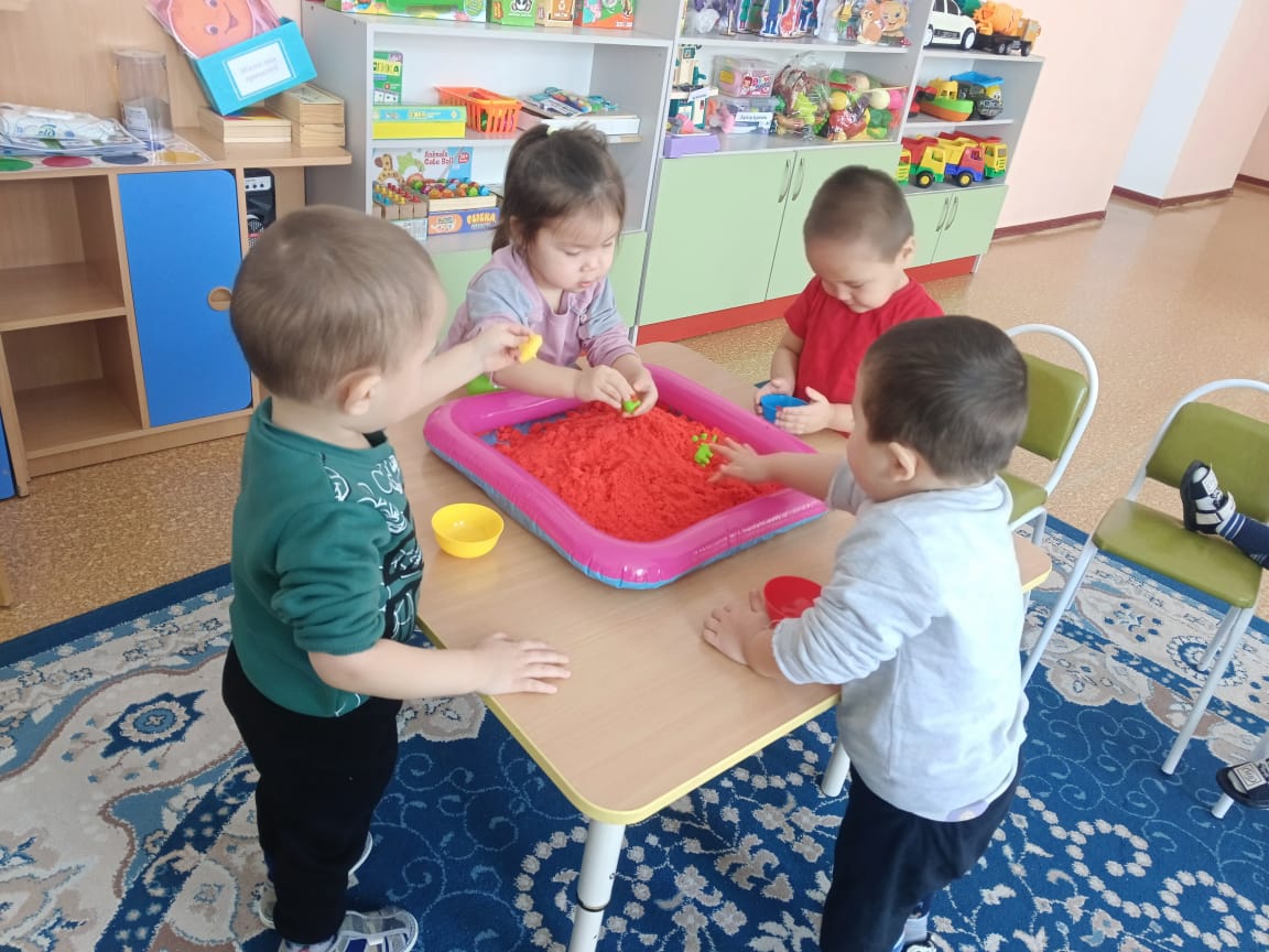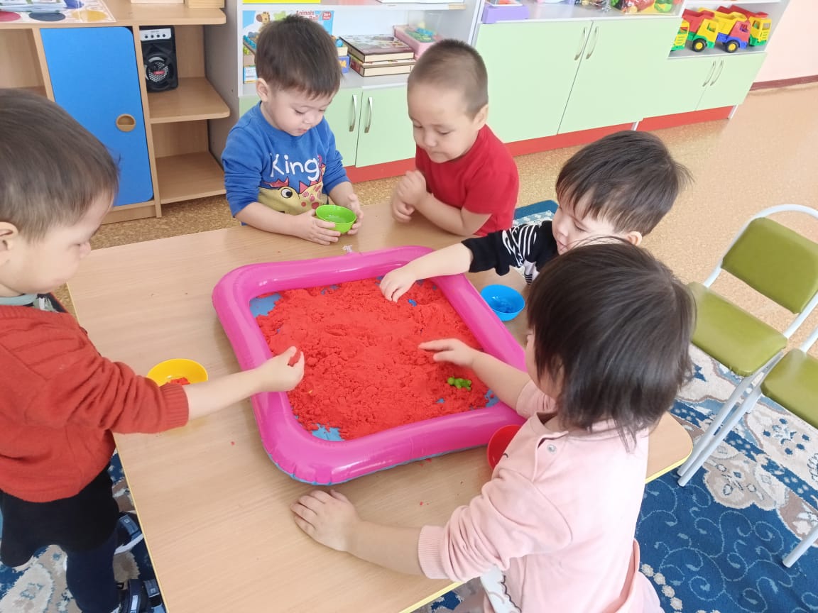 Қыстың суық күндерін де сыртқа шығу мүмкін болмаған жағдайда балалармен құммен ойнайтын түрлі ойындар ұйымдастырылады.
