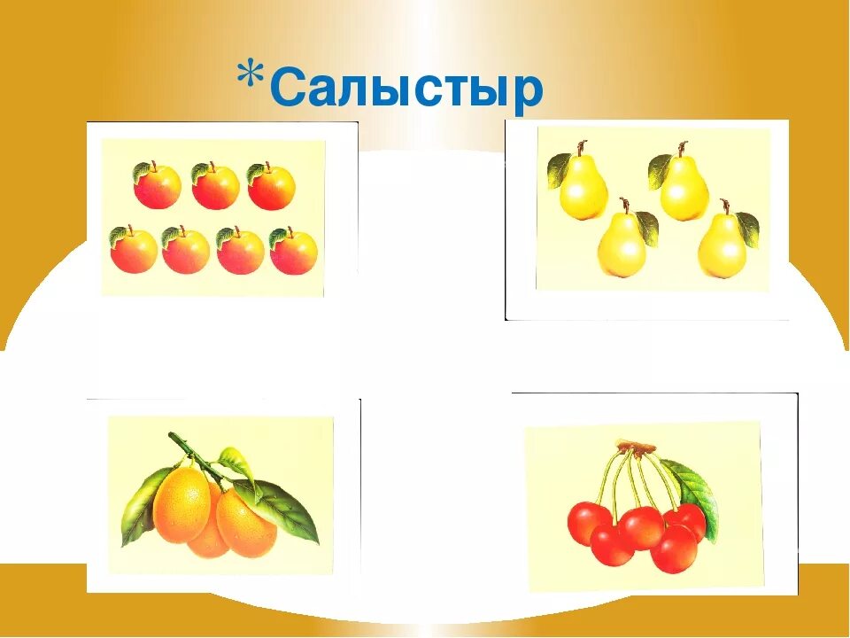 Мақсаты: осының арқасында оларды бір топқа біріктіруге бола тын заттардың өзара қарапайым байланыстарын анықтау икемділІк терін, сондай-ақ баланың заттардың жинақтаушы атауын меңгеру деңгейін анықтау. Тапсырманың сипаттамасы: балаға бір топқа жататын 3 сурет, мысалы, сәбіз, қияр, қызанақтың суреті ұсынылады. Бала берілген суретті жинақтаушы бір ұғыммен атауы тиіс. 17