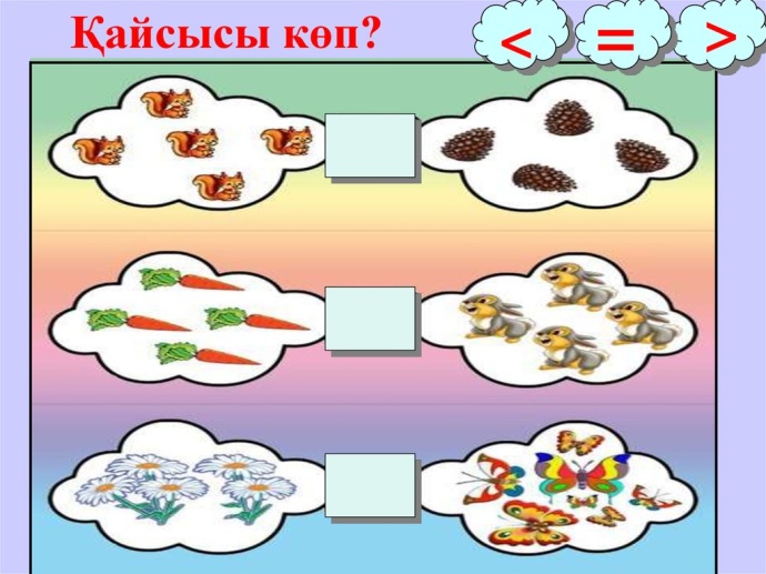 Мақсаты: Сипай сезіп, санау арқылы қарамай-ақ екі топтағы зат тарды салыстыруға үйрету (артық, кем, тең); санау дағдыларын бекі ту; салыстыруда беттестіру тәсілін қолдана білу. Тәрбиеші үстелінің үстінде орамалмен жабылған заттардың екі тобы (4 кірпіш, 5 жүк машинасы) қойылады. Шақырылған бала бір топтағы заттардың санын орамалды ашпай, қолмен ұстап санау арқы лы анықтап, қорытынды санды айтады және осылайша екінші топ тағы заттар да саналады. Қарамай-ақ, қай топтағы заттардың артық не кем екенін салыстырады. Содан кейін жабулы орамал алынады да, барлық балалармен жауаптың дұрыстығы тексеріледі. Ары қарай топтарды салыстыру арқылы неше артық, неше кем екенін анықтау, теңестіру жұмыстарын жүргізуге болады.