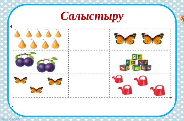 Мақсаты: Балаларға екі суреттің немесе заттың айырмашылы ғын таба білуге; өз ойын айта білуге үйрету; ақыл-ойларын дамыту; шыдамдылыққа, досының жауабын тыңдай білуге дағдыландыру. Бұл ойында тәрбиеші сенсориканы, көлемді, кеңістік қатынасын, санын салыстыру үшін белгілі бір мақсатты көздейді. Ары қарай 23 салыстыратын заттардың санын арттыра отырып, бірнеше нұсқа ларын қатарынан істеуге болады. Ойын өткен материалды бекітуге арналған. Тәрбиеші балалардың сөйлемді дұрыс байланыстырып сөй леуін қадағалайды. Балалар екі затты салыстырады.