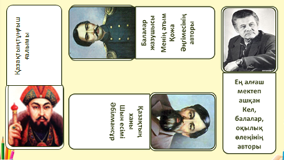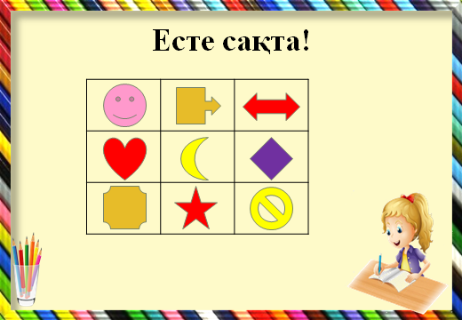 Бір, екі, үш, Жинап алдық күш, Төрт, бес, алты, Болайық елдің алды. Дәптерімізді ашайық, Көрсетілген үлгіге, Әдемі етіп жазайық. |