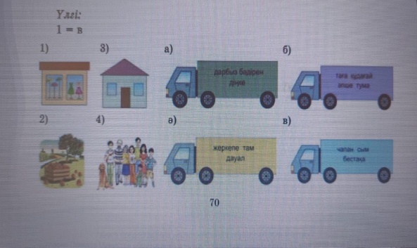 2-тапсырма. Тыңдалым мәтіні бойынша сұрақтарға жауап бер. 1. «Жеті түрін ғаламаттың сипаттап...» деген өлең жолдарын қалай түсінесің? Геродот жайлы деректерді парталасыңмен бөліс. 2. Өлең жолдарындағы әлемді таңғалдыратын нелер? Олар несімен қызықты? 3. Астана «сегізінші ғаламат» бола ала ма? Себебін түсіндір. Тілдік бағдар 70-бет Диалект сөздер Диалект сөздер – белгілі бір жердегі тұрғындар қолданылатын сөздер. Диалект сөздер жалпыхалықтық болып есептелмейді. Өйткені олардың әдеби тілде баламалары болады. Диалект сөздер түрліше болып келеді. Мысалы, тыңла – тыңда, құдағай – құдағи, полат – болат, баралы – баралық, бережақ – бере-шек, келулі – келдіт.б. Қазіргі әдеби тілімізге біраз диалект сөздер еніп, жалпы халықтық тілге айналды. Мысалы: арасан суы, жейде, ұжым, кеден, немелтай (шөберенің баласы), үшем, төртемт.б. Тіл дегі бұл құбылыс әдеби тілді байытудың бір жолы болып есептеледі. 9-тапсырма. Оқулық 72-бет Төмендегі сөйлемдерден диалект сөздерді тауып, әдеби тілдегі нұсқасымен салыстыр. 1.Құдағай, сізді ауқат ішсін деп төр тамға шақырып жатыр атамдар. 2. Нүсірлеп құйған жаңбыр суы жыра, сайларға сыймай ағып жатыр. 3. Балалар, пахтаның чатағымен жүріп, сабаққа қо-палдау дайындалған боларсыңдар. 4. Дегенмен мынадай сұраққа жауап беріп көргін. Еш қысылмағын, саспағын. («Қазақ диалектологиясы» кітабынан 4-тапсырма. Төмендегі диалект сөздерді тиеп алған жүк көліктерін өз тұрақтарына жеткіз.
