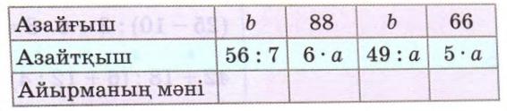 Барлығы: 6,7,8,9 сандарына кестелік көбейту және бөлу жағдайларын құрастыру; Көбі: өрнектерді оқу және жазу барысында көбейту және бөлу компоненттерін атау; Кейбірі: жанама сұрақтарды талдау және олармен есептер құрастыру; |