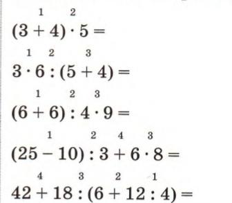 Жауабы: (3+4)×5=7×5=35 3×6:(5+4)=18:9=2 (6+6):4×9=36:12=3 (25-10):3+6×8=5+48=53 42+18: (6+12:4)=18:9+42=2+42=44