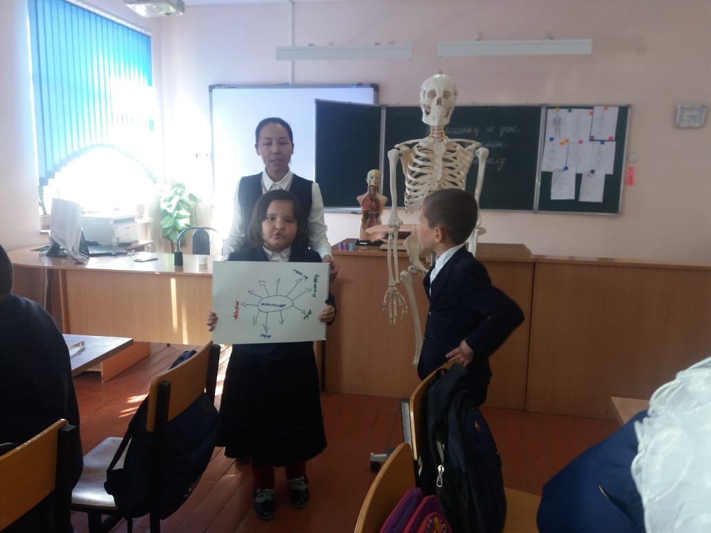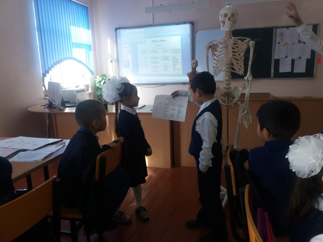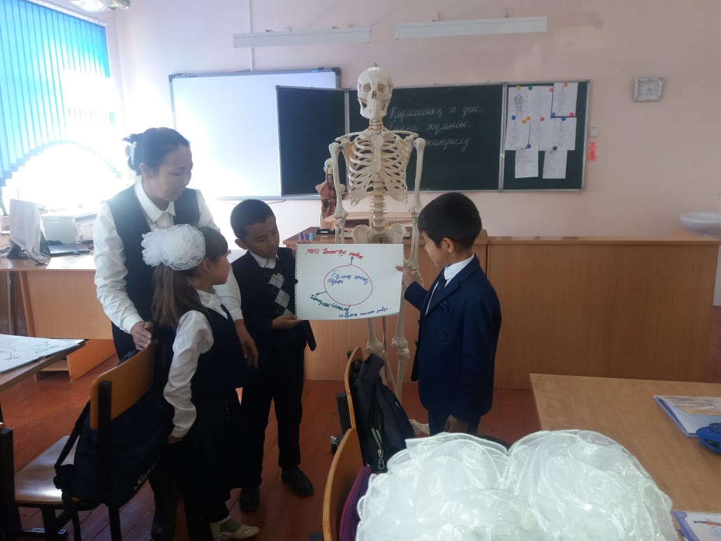 Ұйымдастыру. Тірек сөздер арқылы білім алушыларды топқа біріктіру 1.Қуаныш. 2.Шаттық. 3.Бақыт. Психологиялық ахуал Тыныштық-1 шапалақ Ұйымшылдық -2 шапалақ Белсенділік- 3 шапалақ Үй жұмысы «Миға шабуыл» әдісі -Бас сүйектері -Қабырға сүйектері -Омыртқа -Аяқ сүйектері -Қол сүйектері /түсінгендерін айтады/слайдпен Дескриптор: -Қаңқа сүйектері туралы білімдері толығады -Кез-келген заттың қаңқасы болатынын біледі «Почта әдісі» Сұрақтар: «Қуаныш» тобы 1: Қаңқа дегеніміз не? 2:Қаңқаның қызметі қандай? 3:Адам денесін сүйексіз елестетіп көрейікші. Не байқадық? «Шаттық» тобы 4:Қаңқа дұрыс дамыса,адам қандай болып көрінеді? 5:Сүйектер бір-бірімен қалай байланысады? 6:Партада қалай отыру керек? «Бақыт» тобы 7:Қаңқа бөліктерін ата.Олар не үшін керек? 8:Дене сымбаты дегеніміз не? 9:Дене сымбатың дұрыс қалыптасу үшін не істеу керек? Дескриптор: -Топпен жұмыс жасай алады -Берілген сұрақтарға байланысты өз ойларын айта алады |