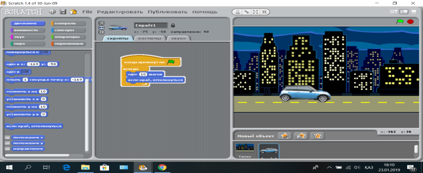 Жеке жұмыс: Оқушылар компьютерге отырып Scratch программалау бағдарламасын іске қосып, тапсырманы орындайды. Ұлдардың тапсырмасы: түнгі қалада машинаны қозғалту.