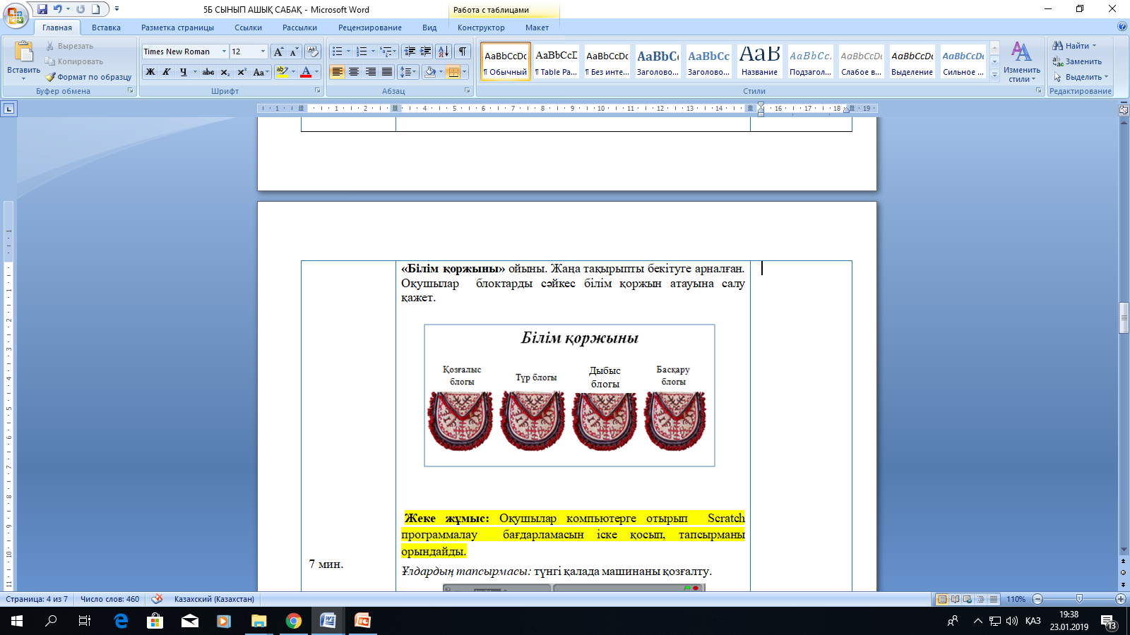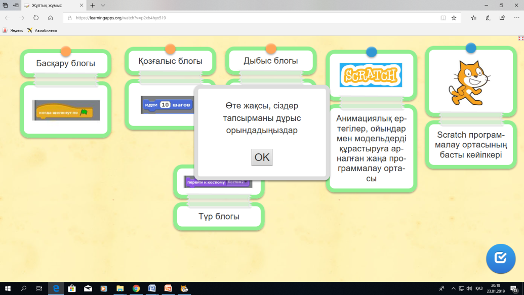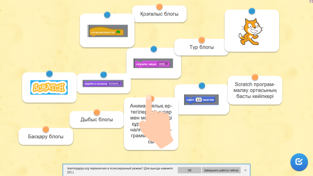 Ой қозғау» әдісі арқылы оқушылар Learning Apps бағдарламасында ашылған сурет бойынша өз ойларын айтады. «Scratch программалау ортасындағы блоктар» Блоктар 10 түрлі түсті топтамаларға бөлінген. Блоктар топтамасын суретші палитрасындағы бояу текшелерге ұқсас болғандықтан блоктар палитрасы деп атайды. Алайда программалаушының суретшіден ерекшелігі – анимацияланған нысандардан құрастыруында. Блоктар палитрасындағы блок командаларының көмегімен скриптілер дайындалады.