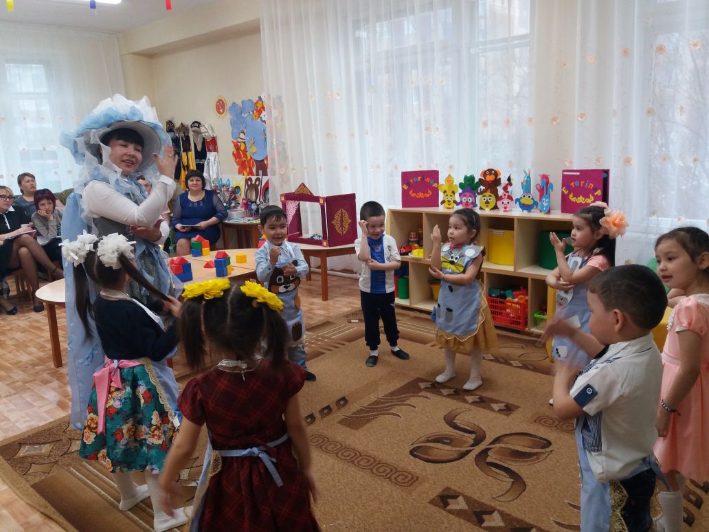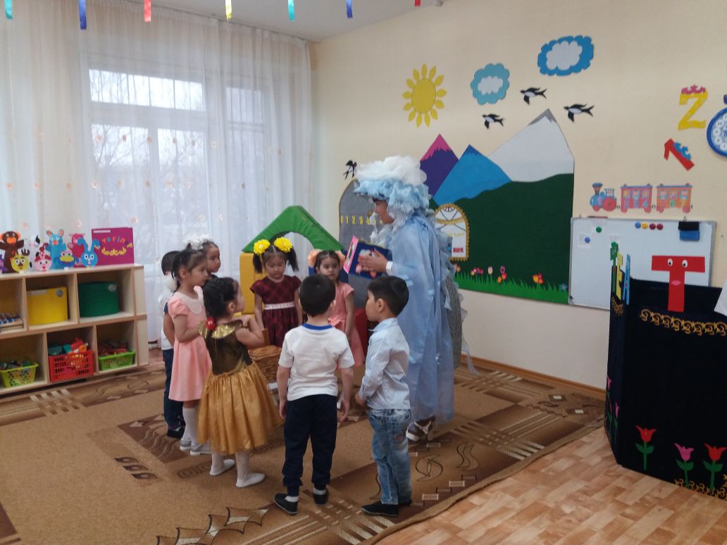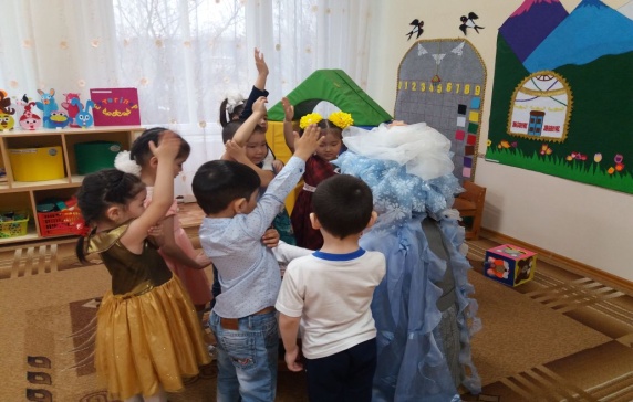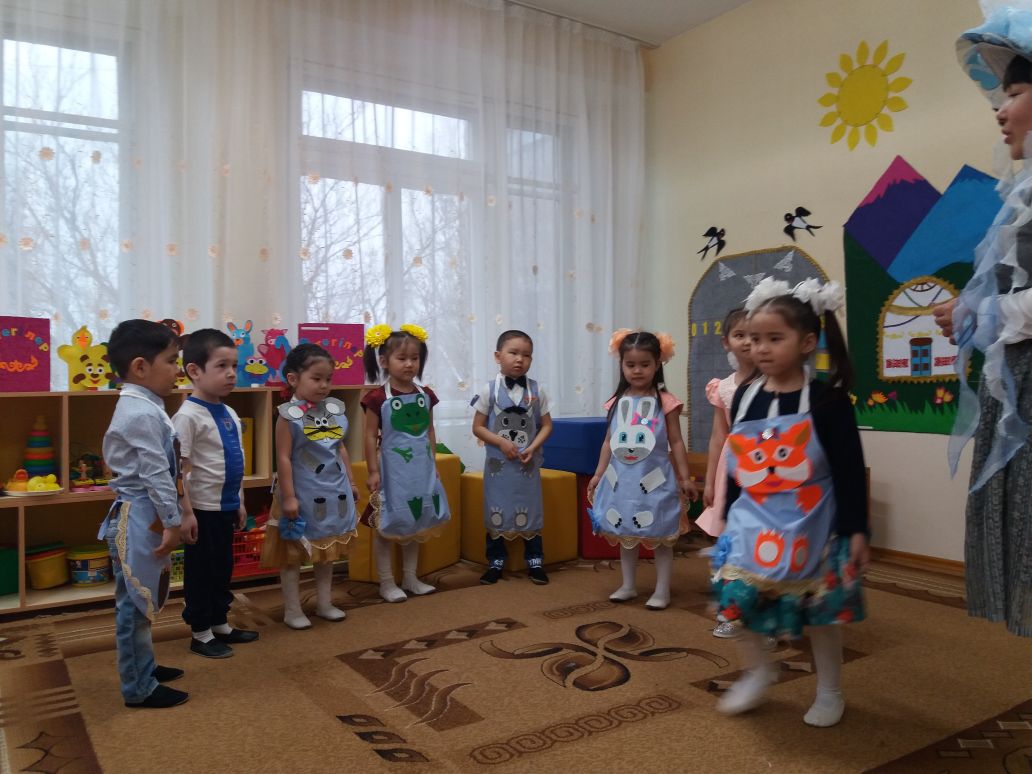 Мақсаты: Ертегі мазмұны бойынша бойларына мейрімділікті, адалдық қасиеттерін сіңіру. Балаларды бірігіп жұмыс жасауға, ертектің кейіпкерлердің образдарына айналуға үйрету. (цель: по содержанию сказки учить доброжелательным, честным качествам; учить детей перевоплощаться в образы героев сказки, работать сообща.
