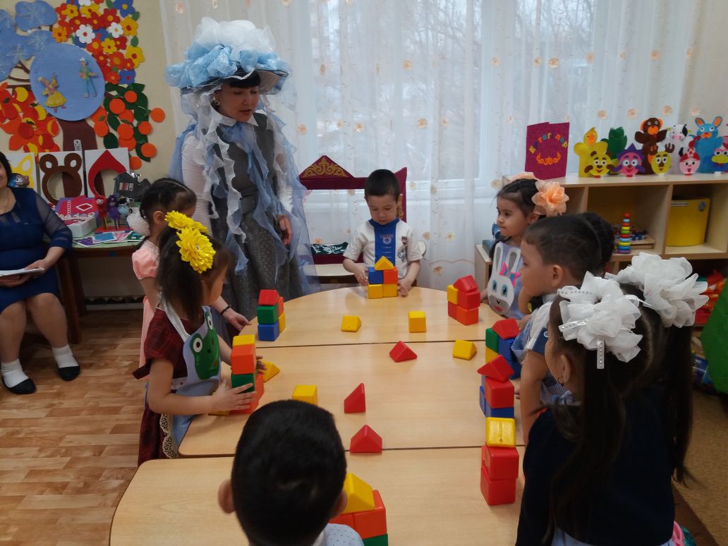 Жабдықтар/оборудование: ертегі кейіпкерлерінің суреттер, кейіпкерлердің алжапқыштары, шаршы мен үшбұрышты пішіндер, шаршы «Бұл кім?» (айналармен), сиқырлы сандықша, қағаз көгершіндер. (картинки с героями сказки, фартуки с героями, фигуры квадратной и треугольной формы, квадрат «Угадай кто?» (с зеркальцами), волшебный сундучок, бумажные голуби).