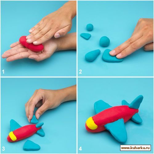 Бұл сопақша пішінді ұшақтың денесі. -Ермексазды бірнеше бөлікке бөліп, домалақтаймыз да,бірінші бөлікті алып саусақпен созып ұшбұрыш пішінін жасаймыз Қалған бөліктерінен төртбұрыш, тіктөртбұрыш пішіндерін жасаймыз.