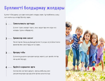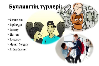 Балалар буллинг туралы түсінік алады және оның түрлерімен танысады. Осы әрекеттер қай жерлерде, қандай жағдайларда орын алатынын айтады.