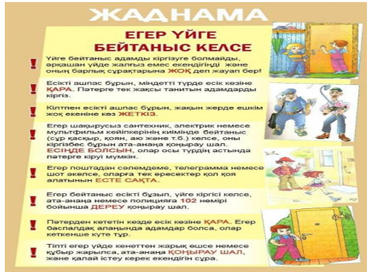Сабақтың мақсаты: бейтаныс адамдармен қарым-қатынас жасамау дағдыларын қалыптастыру. Білімді өзектендіру. Өткенді қайталау - Сен көшеде бейтаныс адамдармен сөйлескен жағдайлар болды ма? Бұл жағдай қалай болды? - Неге ата-аналар мен педагогтер балаларға көшедегі бейтаныс адамдармен сөйлесуге, қарым-қатынас жасауға тыйым салады? Негізгі бөлім. Топтық жұмыс. Әр топ түрлі жағдаяттар жазылған карточкаларды алып, сахналап көрсетеді.