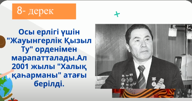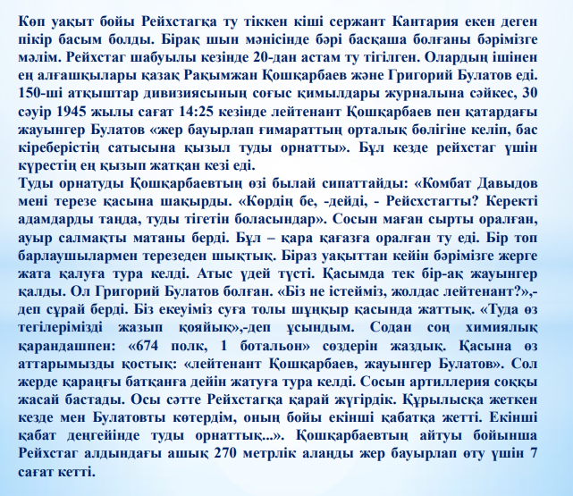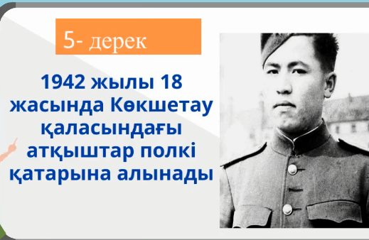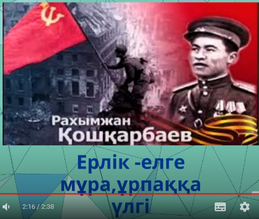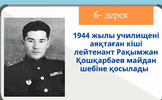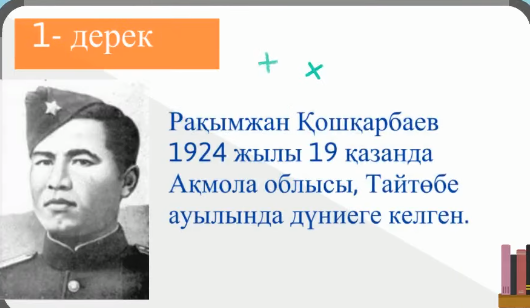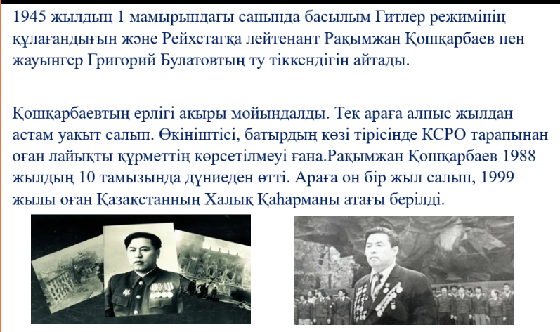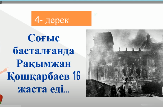 Туған жылы: Рақымжан Қошқарбаев 1924 жылы 19 қазанда Ақмола облысында дүниеге келген. · Соғыс жылдары: 1941 жылы соғыс басталғанда Қошқарбаев жас сарбаз ретінде майданға аттанады. Ол 150-ші атқыштар дивизиясының құрамында Берлинге дейінгі шайқастарға қатысып, 1945 жылы 30 сәуірде Рейхстаг ғимаратына ту тіккен. · Ерлігі: Рақымжан Қошқарбаев және оның жауынгер серігі Григорий Булатов Берлинді азат ету кезінде Рейхстагқа жетіп, фашистік Германияның басты символы саналатын ғимараттың үстіне Қызыл Туды тігеді. Бұл оқиға Кеңес Одағының жеңісінің нышаны болып қалды. · Соғыстан кейінгі өмірі: Соғыстан кейін Рақымжан Қошқарбаев бейбіт өмірге оралып, елдің дамуына үлес қосты. Ол түрлі жауапты қызметтер атқарып, халық арасында үлкен құрметке ие болды. Видео көрсетілім Рақымжан Қошқарбаевтың өмірі мен ерлігі туралы деректі фильмнен үзінді көрсетіледі.