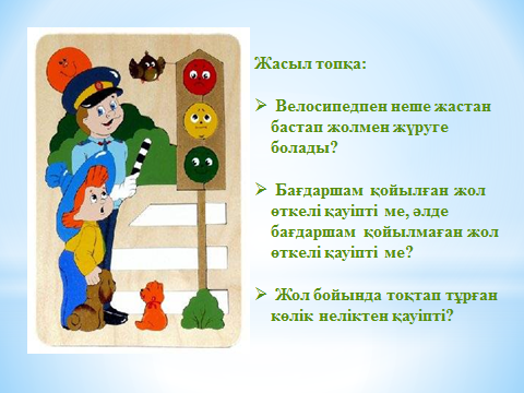 Әр топқа лото ойыны таратылады. Жол белгілерін дұрыс тапса, жол ережесіне байланысты мазмұнды сурет құрастырылады. Ойынның мақсаты: жол белгілерін еске түсіру, шатастырмауға үйрету.