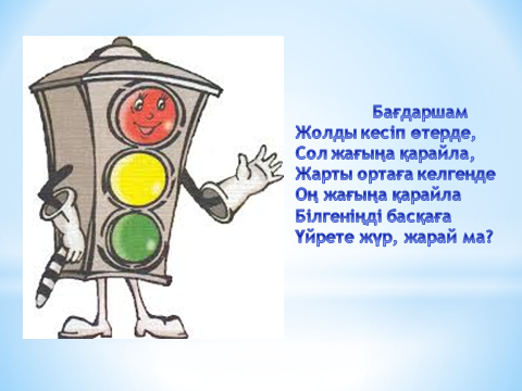 Бағдаршам макетін киген оқушы және бағдаршамның үш көзін ұстаған төрт оқушы ортаға шығып, тақпақтар айтады.