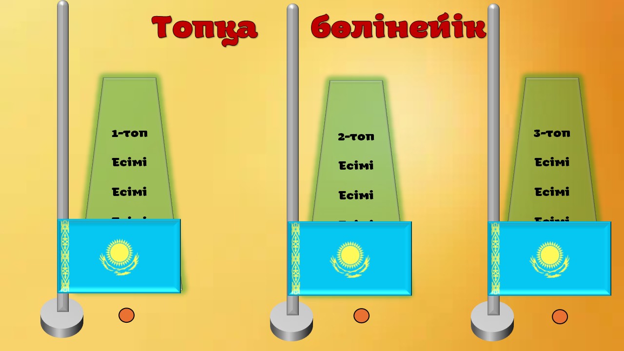 Мұғалім сыныппен амандасады, жылы сөздер айтады («Бүгінгі күніміз сәтті өтсін», «Бәріңе табыс тілеймін»). PowerPoint-тағы «топқа бөлу» слайдына өтіп, батырманы басқанда Қазақстан туы көтеріледі, астынан әр топтағы балалардың есімдері шығады. |