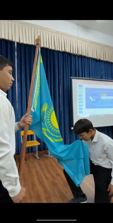 (Сахнада мемлекеттік ту ілінген, фондық музыка “Көк тудың желбірегені”)