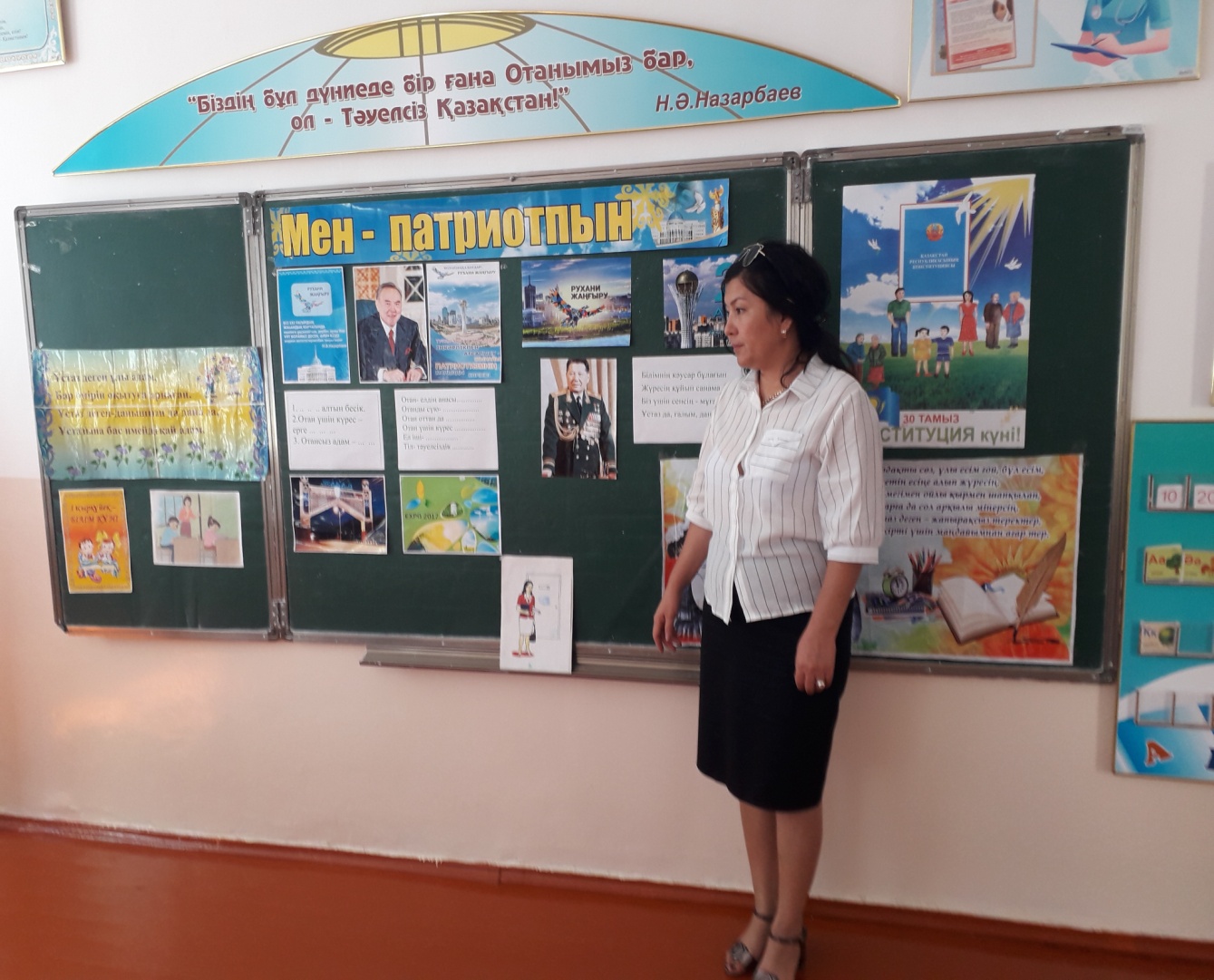 Көрнекілігі: Қазақ елі суреттері, Қазақстан Республикасының рәміздері: Туы, Елтаңбасы, Әнұраны, білім туралы нақыл сөздер,шарлар.