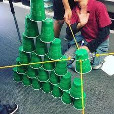 Педагогтар стакандарды қолмен ұстамай, жіпке керілген резенкенің көмегімен мұнара құрастырады. Мақсатқа жетуде кездескен кедергілерді жаттығуды барлық топ аяқтаған кейін өз пікірлерін айтады. Сұрақтар: