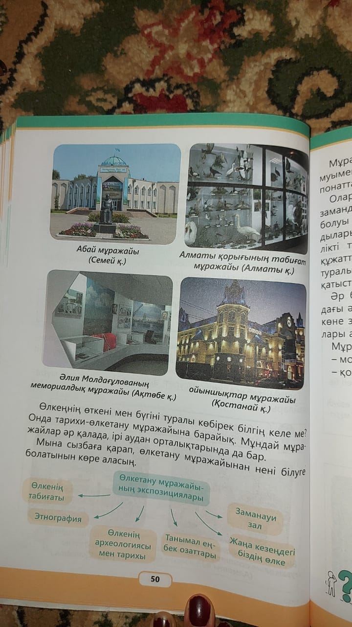 Сабақ мақсатымен оқушыларды таныстыру тарихи мұражайлар туралы білу мұражайдың өзіндік жобасын ұсыну. -Сәлеметсіздер ме?Бүгін сіздермен бірге Қазақстан қалаларына саяхатқа шығып,ондағы мұражайлармен танысатын боламыз.Саяхатымызды Орал қаласынан бастаймыз.Саяхатқа шығуға дайынбыз ба? Орал-Ақтөбе-Семей-Қостанай-Алматы-Астана қалаларына саяхатқа шығамыз. Ой қозғау. Жалпы Мұражай деген не? Онда нелер сақталады? Мұражайға барып көргендеріңіз бар ма? Тірек сөздер: Мұражай,экспонат,жәдігер,12 Мұражай ережесімен таныстыру -Тыныштық сақтау -Жәдігерлерді қозғамау -Таныстырушыны мұқият тыңдау. -Жәдігерлерге мұқият болу Саяхатттау арқылы мұражайларды таныстыру арқылы жаңа тақырыпты ашу