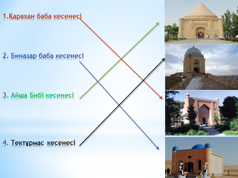 1.Бұл кесене Биназар батардың кесенесі Ұлы жүздің дулат тайпасынан шыққан шымыр руынан. Қоқан хандығына қарсы күресте Сыпатай батырдың сенімді серігінің бірі болған. Шу өзеніне тоған салыпғ ауылын егіншілікпен айналысуға баулыған. Биназар батырдың бейіті Хантауы қыратының «Сұңқар» деген шықтығында орналасқан. 2.Бұл кесене 18 ғасырдың соң кейіпкері мен 19 ғасыр басындағы архтектуралық ескерткіш. Мойынқұм ауданы Кіші Қамқалы ауылының маңында орналасқан. Құралай сұлу зиратының үстіне салынған кесенені Келден батыр салғызған.Құралай сұлу тарихи кейіпкер ақын И.Байзақовтың «Құралай сұлу » поэмасының басты 3. Тектұрмас кесенесі ХІҮ ғасырда салынған. Талас өзенінің оң жағалауында Тектұрмас кесенесі салынған және бұл діни орындарының бірі болған. 2002 жылы кесененің алғашқы орнында жағадан кесене тұрғызылған. .
