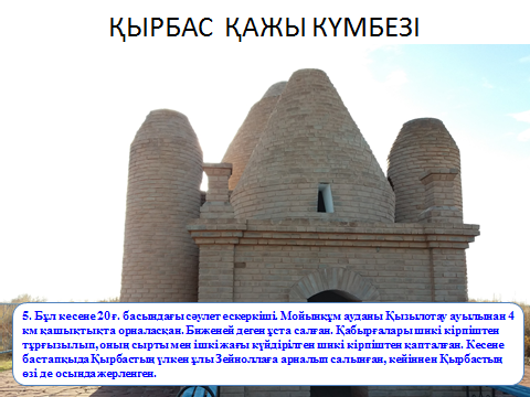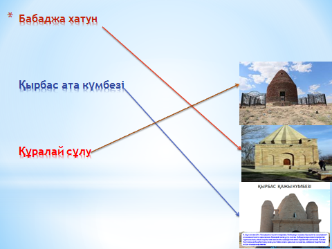 1. Деректермен жұмыс жасап, археологтардың жаңалықтары туралы мәлімет жинап, кестені толтырады. 2. Қырбас ата кесенесінің мағынасын ашады. 3. Құралай Сұлу кесені көне жәдігерлер мұрасын суреттейді. 4. Биназар баба кесенесінің маңыздылығын біледі . |