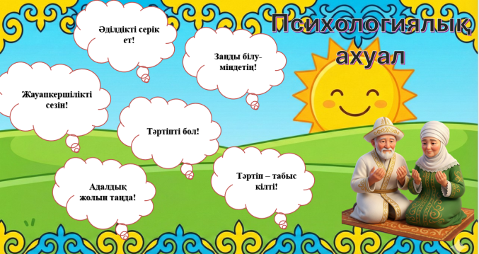 «Құндылықтар батасы» әдісі: Оқушылар шеңберге тұрып, экрандағы бұлттарда жазылған заң мен тәртіпке қатысты нақыл сөздерді (мысалы: «Заңды білу — міндетің!», «Тәртіп — табыс кілті!») кезекпен оқып, бір-біріне жақсы тілек ретінде жолдайды. Бұл оқушылардың құқықтық сауаттылығы мен жауапкершілігін оятуға бағытталады.