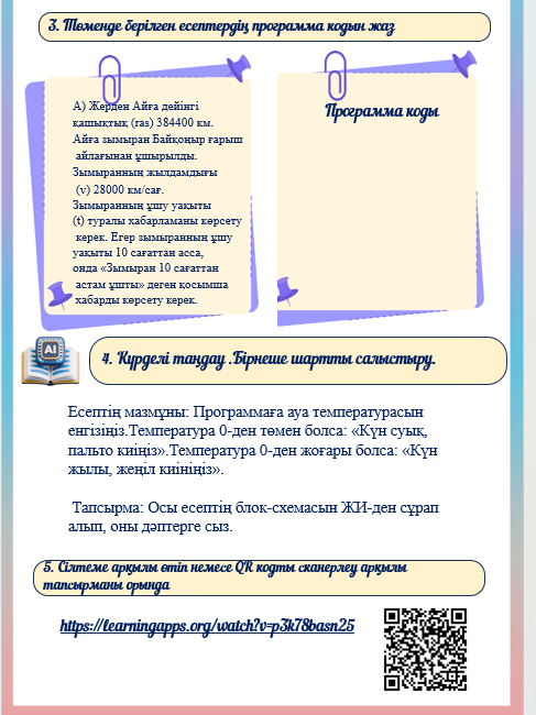 «Мақтау» Оқушылардың белсенділігіне қарай ауызша бағалау: «Жарайсың!», «Жақсы!», «Талпын!» Дескриптор: Мақал ішіндегі логикалық шартты дұрыс анықтайды-1балл Тармақталған алгоритмнің блок-схемасын стандартты фигуралармен дұрыс сызады-1балл ФБ Дескриптор: -логикалық өрнектердің сипаттамасын дұрыс жазады-2балл Дескриптор: -программа кодын дұрыс жазады-1балл -блок-сызбаны дұрыс сызады-1балл Дескриптор: -Қозғалыс формуласын пайдаланып, зымыранның Айға жету уақытын дұрыс есептейді-1балл -дұрыс тұжырым жасайды-1балл Дескриптор: -блок-схеманың құрылымын сақтайды-1балл -логикалық шартты дұрыс анықтайды-1балл |