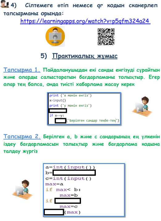 3-тапсырма. Сілтеме өтіп немесе qr кодын сканерлеп тапсырманы орында: h 4-тапсырма. Практикалық жұмыс Пайдаланушыдан екі санды енгізуді сұрайтын және оларды салыстаратын бағдарламаны толықтыр. Егер олар тең болса, онда тиісті хабарлама жасау керек