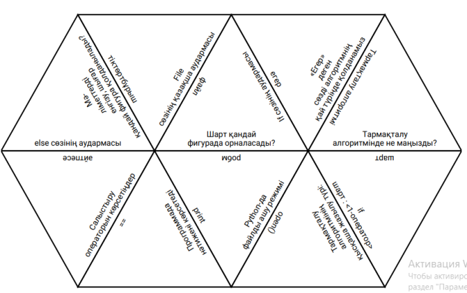 Қобдишадағы затты көреді Экранда көрсетілген тізім бойынша оқушылар топқа бөлінеді Оқушылар топта бірлесе жұмыс жасайды Сұрақтарға жауап береді және Тарсия фигурасын құрастырады. |