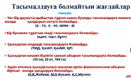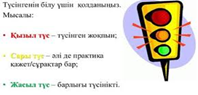 Жағымды ахуал Оқушылар құндылыққа байланысты топқа бөлінеді. Сұрақтарға жауап береді. Жұмбақ шешеді. Сөздерді буынға бөліп буын санын айтады. «Бесік жырынан» үзінді тыңдайды. Сұрақтарға жауап береді. Ережемен жұмыс жасайды. Топта бірігіп тапсырманы орындайды. Кері байланыс жасайды |
