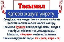 Психологиялық ахуал қалыптастыру «Біз қандаймыз?» әдісі 1.Әдемісің, әдептісің! 2. Ақылдысың,тәртіптісің! 3. Сенімдісің, талаптысың! Оқушылар, біз бәріміз қандаймыз? тәп-тәтті балдаймыз! Өткенді пысықтау Интертақта арқылы тапсырма. Сөздерді оқып, буынға бөледі. Топқа бөлу: 1.Еңбекқор 2.Шығармашыл 3.Ізденімпаз Құндылық мақсаты: Мемлекеттік тілді білу Жаңа тақырып: Миға шабуыл «Пазл» әдісі –Буын неден құралады? –Сөздегі буын саны неге байланысты болады? –Бір буынды сөздерге мысал келтір. (екі, үш) Сұрақтарға жауап бергеннен соң, жасырын суреттен тасымал сөзі шығады. –Оқушылар, өздерің көріп отырғандай, бүгінгі жаңа сабағымыздың тақырыбы қалай аталады? Оқушылар: «Тасымал» деп аталады. –Бұл сөзді естігендерің бар ма? ЕБҚ: Ана, мектеп сөздерін буынға бөліп, буын санын анықта. Жұмбақ шешу: Ғажап екен кіп-кішкентай сәнді үй. Ішінде ұйықтап жатыр балқып әлди. Бұл не? –Бесікке кімді жатқызады? –«Бесік жырын» кім орындайды? -Бесік деген не? - Бесік неден жасалған? Тыңдалым Ән тыңдау. Бесік жырынан үзінді тыңдау. ФС тапсырмасы 1.Жеке оқушыларға оқытады. Суретпен жұмыс Суреттен кімдерді көріп тұрсыңдар? Тағы нені байқадыңдар? Суретке қарап, өлеңнің мазмұнына болжау жасап көріңдерші. 1.Өлең неліктен «Бесік жыры» деп аталады? 2.Өлеңде анасы баласын нелерге теңеген? ЕБҚ тапсырма 1.Анаңның айтатын бесік жырын айта аласың ба? 2.Анаң сені қалай еркелетеді? құрақ, құндыз, бала сөздерін жазып келе жатқан жолға сыймаса қалай жазасың? Балалардың жауабын тыңдау. Балаларға осы сөздерді шапалақпен буынға бөлгізу. Балалармен бірге тұжырымдап, ережемен таныстыру. Мына сөзді тасымалда: Құндызым Ережемен жұмыс Бүгін біз тасымал туралы үйренеміз. Тасымал - сөздерді бір жолдан екінші жолға дұрыс көшіру.